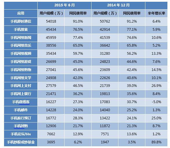 2014.12-2015.6中國(guó)手機(jī)網(wǎng)民對(duì)各類(lèi)手機(jī)應(yīng)用的使用率