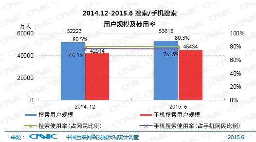 截至2015年6月,我國(guó)搜索引擎用戶(hù)規(guī)模達(dá)5.36億,使用率為80.3%,用戶(hù)規(guī)模較2014年底增長(zhǎng)1392萬(wàn)人,增長(zhǎng)率為2.7%;手機(jī)搜索用戶(hù)數(shù)達(dá)4.54億,使用率達(dá)76.5%,用戶(hù)規(guī)模較2014年底增長(zhǎng)2520萬(wàn)人,增長(zhǎng)率為5.9%。