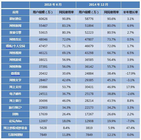 2014.12-2015.6中國(guó)網(wǎng)民對(duì)各類(lèi)網(wǎng)絡(luò)應(yīng)用的使用率