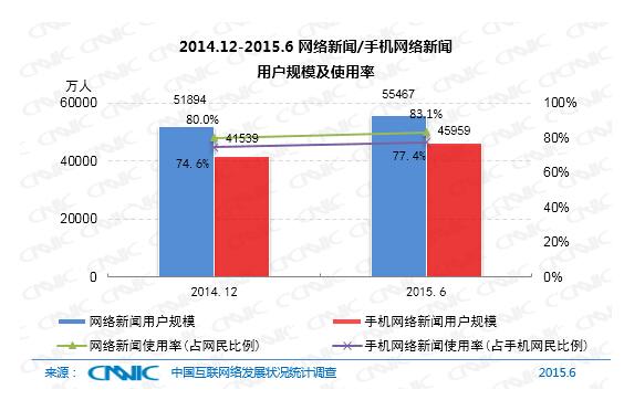 截至2015年6月,我國網(wǎng)絡(luò)新聞?dòng)脩粢?guī)模為5.55億,較2014年底增加3572萬,增長率為6.9%。網(wǎng)民中的使用率為83.1%,比2014年底增長了3.1個(gè)百分點(diǎn)。其中,手機(jī)網(wǎng)絡(luò)新聞?dòng)脩粢?guī)模為4.60億,與2014年底相比增長了4420萬人,增長率為10.6%,網(wǎng)民使用率為77.4%,相比2014年底增長2.8個(gè)百分點(diǎn)。