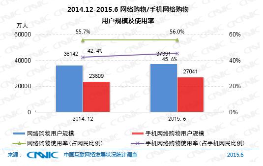 2014.12-2015.6網(wǎng)絡(luò)購物/手機(jī)網(wǎng)絡(luò)購物用戶規(guī)模及使用率