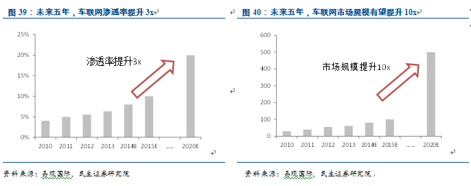 車聯(lián)網(wǎng)硬件價(jià)格下降,從高端車系向大眾車系普及。隨著移動(dòng)互聯(lián)網(wǎng)設(shè)備的成熟和發(fā)展,車聯(lián)網(wǎng)硬件從過(guò)去1,000美元以上已經(jīng)降到500美元。在互聯(lián)網(wǎng)廠商介入后,相關(guān)設(shè)備的價(jià)格將繼續(xù)快速下降。此外,根據(jù)產(chǎn)業(yè)鏈調(diào)研,大多數(shù)國(guó)際整車廠已經(jīng)開始將車聯(lián)網(wǎng)預(yù)裝在大眾車系上,包括榮威、吉利等本土汽車品牌也已經(jīng)逐漸在部分車型上預(yù)裝車聯(lián)網(wǎng)系統(tǒng)。