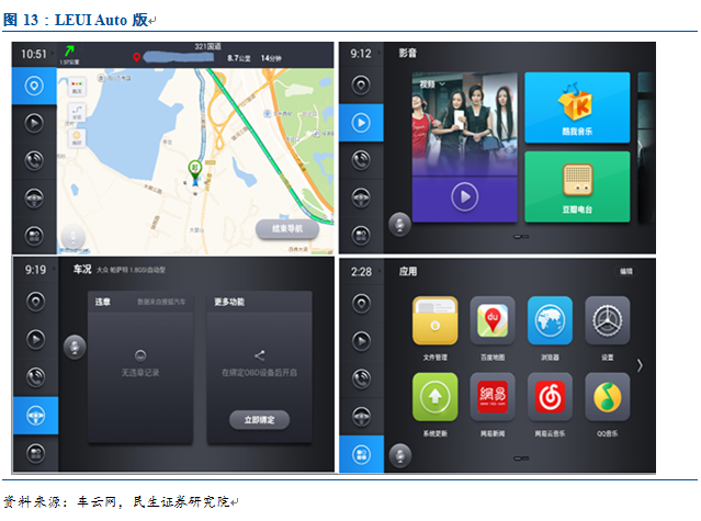 國(guó)內(nèi)互聯(lián)網(wǎng)公司在車載智能產(chǎn)品領(lǐng)域的布局,我們可以發(fā)現(xiàn)百度CarLife首先不論在車機(jī)端還是手機(jī)端,兼容性更強(qiáng)大,其次可以僅作為一個(gè)APP,由自身的優(yōu)勢(shì)地帶百度地圖為基礎(chǔ)延伸多項(xiàng)應(yīng)用,還由于其個(gè)性化定制的開放性,也可以從車企的接受和利用程度方面發(fā)展為整套解決方案,接替車機(jī);騰訊的趣駕Wedrive主要方向是把社交引入車聯(lián)網(wǎng)的大生態(tài)圈中,這一點(diǎn)充分利用了騰訊在社交方面累積的資源和優(yōu)勢(shì);樂視LeUI Auto相當(dāng)于一整套解決方案,如果車主選擇使用它,就代表認(rèn)同它完全占據(jù)汽車的中控臺(tái)。