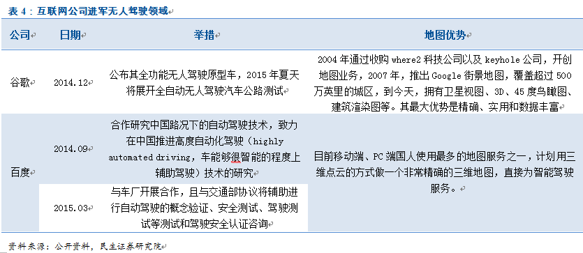 谷歌與百度基于地圖等方面的原有優(yōu)勢(shì),主動(dòng)進(jìn)軍無人駕駛。無人駕駛產(chǎn)品和技術(shù)主要包括識(shí)別技術(shù)、決策技術(shù)和控制技術(shù)三個(gè)方面,切入無人駕駛領(lǐng)域的互聯(lián)網(wǎng)公司以谷歌和百度為代表,由于無人駕駛的數(shù)據(jù)依賴于高精度地圖,通過傳感器對(duì)道路信息進(jìn)行獲取整合,通過信息處理運(yùn)算做出反應(yīng),達(dá)到車輛自動(dòng)行駛的目的,谷歌和百度基于在地圖等方面的原有優(yōu)勢(shì),主動(dòng)進(jìn)軍汽車領(lǐng)域的無人駕駛方向。