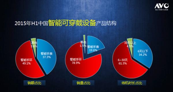 2015年上半年中國智能可穿戴設備的產(chǎn)品結(jié)構(gòu)從銷額來看,手環(huán)占比50%,智能手表37.3%,其他的可穿戴只有3.6%左右的份額。從銷量來看智能手環(huán)78.9%,手表占到20%左右。從待機時間來看,待機在6天以下占比34.2%,6天至30天的產(chǎn)品占比61.3%左右,30天以上僅占 4.5%。