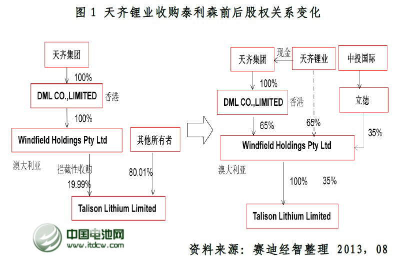 2012年12月,停牌多日的天齊鋰業(yè)發(fā)布公告稱擬募集不超過40億元購買澳大利亞泰利森65%的股權(quán)。天齊鋰業(yè)對泰利森的收購首先通過控股股東在澳大利亞設(shè)立文菲爾德,然后以文菲爾德為主體來完成對泰利森的收購。在收購泰利森之前,天齊鋰業(yè)的競爭對手洛克伍德曾宣布以每股6.5加元的價格現(xiàn)金收購泰利森100%的普通股股權(quán),為防止洛克伍德完成收購后對鋰礦資源的壟斷,天齊鋰業(yè)采取攔截型收購方式公開收購泰利森19.99%的股份,成功阻止了洛克伍德的全面收購計劃。