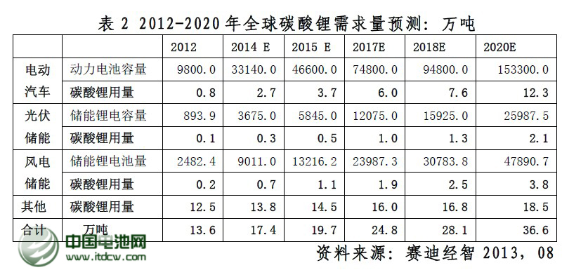 從風(fēng)光儲能領(lǐng)域來看,賽迪經(jīng)智預(yù)計2015年和2020年全球光伏和風(fēng)電的合計裝機容量分別為544GW和938GW,按照每天3.5小時計算,其發(fā)電量分別為1900Gwh和3280Gwh,按照10%左右的比例配備儲能電池,則分別需要190Gwh和328Gwh的儲能電池,假設(shè)2015年和2020年鋰電池在儲能電池中的比例分別為20%和45%,則將為鋰電池創(chuàng)造19.1Gwh和73.8Gwh的市場空間,從而測算出將為碳酸鋰創(chuàng)造1.6萬噸和5.9萬噸的市場空間。在其他領(lǐng)域我們假定碳酸鋰需求量將按照5%的速度遞增,從而2015年和2020年將具備14.5和18.5萬噸的需求量。總之,從需求量的角度來講,2015年和2020年全球碳酸鋰的需求量將分別達到19.7萬噸和36.6萬噸。