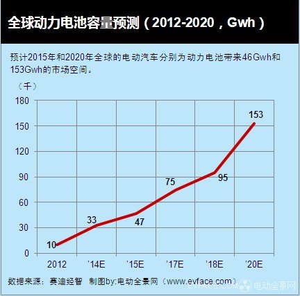 從電動汽車來看,預計2015年和2020年全球的電動汽車的產量分別為430萬輛和1100萬輛,而其中包含EV、PHEV和HEV,其動力電池單位容量平均分別為50Kwh、10Kwh和2Kwh,2015年和2020年分別為動力電池帶來46Gwh和153Gwh的市場空間。