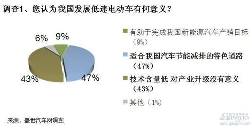 低速電動汽車一般指速度低于70km/h的簡易四輪純電動汽車。發展這種電動汽車是否有意義?蓋世汽車網就此對汽車業內人士進行調查(2013年10月14-20日,參與人數1693位)時發現,有43%的人士認為低速電動汽車技術含量低,對產業升級沒有意義。而且很多人對低速電動汽車的安全性、電池的環保性等方面有很多質疑。