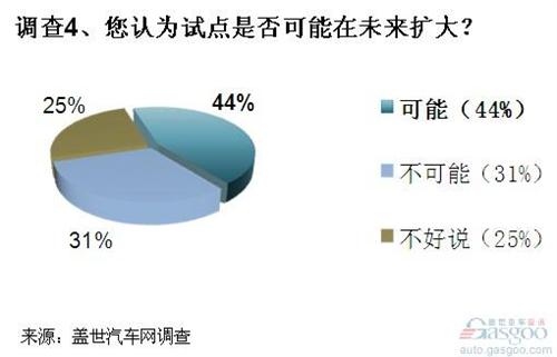 發展低速電動汽車雖然還存在許多問題,但其現實意義和對新能源規劃目標的助力也同樣明顯,政府可能通過在更多的省市試點中發現問題并尋求解決之道。調查4中,有44%參與者認為未來的試點省市存在進一步擴大的可能。