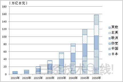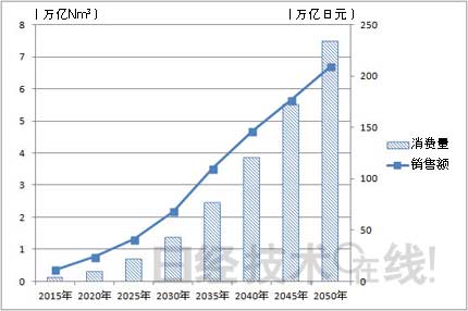 世界各地都掀起了利用氫能源的浪潮。日經BP清潔技術研究所2013年10月24日發行的報告《世界氫基礎設施項目總覽》顯示,全球氫基礎設施的市場規模到2050年將達到約160萬億日元(圖1)。