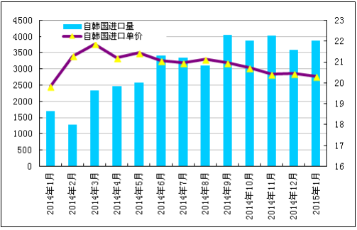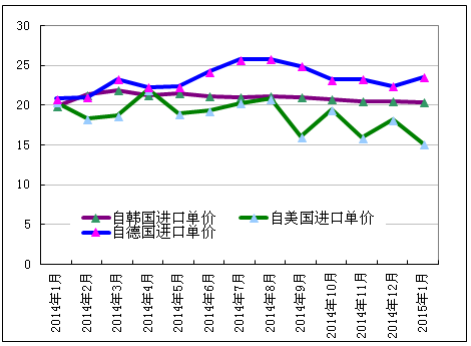 2015年1月份從韓國進口多晶硅量增加至3867噸,環比增幅為7.7%;1月份進口單價微幅下降至20.31美元/千克,環比降幅為0.78%。