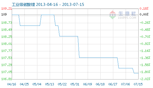 7月15日工業級碳酸鋰商品指數為107.01,與昨日持平,較周期內最高點112.10點(2012-11-04)下降了4.54%,較2012年01月05日最低點98.94點上漲了8.16%。(注:周期指2011-09-01至今)