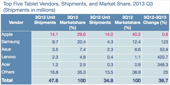根據(jù)IDC公司最新公布的數(shù)據(jù)顯示蘋果在今年第三季度共計(jì)發(fā)售1410萬(wàn)臺(tái)iPad,相比較第二季度環(huán)比下降50萬(wàn)臺(tái)。而蘋果的最大競(jìng)爭(zhēng)對(duì)手三星的Android設(shè)備在本季度的出貨量為970萬(wàn)臺(tái),位居第二。