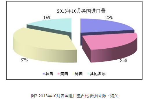據(jù)10月份分國別進(jìn)口數(shù)據(jù)顯示,自韓國、美國、德國三國共進(jìn)口多晶硅4519噸,占總進(jìn)口量的84.8%,其中從韓國進(jìn)口量為1154噸,占總進(jìn)口量的21.7%;從美國進(jìn)口量為1377噸,占總進(jìn)口量的25.8%;從德國進(jìn)口量為1988噸,占總進(jìn)口量的37.3%;其他地區(qū)進(jìn)口量為1080噸,僅占總量的15.2%。自美國、韓國和德國進(jìn)口多晶硅量均有不同程度減少,其中自韓國進(jìn)口量降幅最大,跌幅為45.5%,與韓國OCI公司發(fā)生的事故有一定關(guān)聯(lián),導(dǎo)致多晶硅供應(yīng)減少。