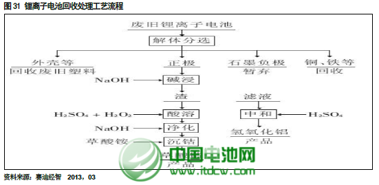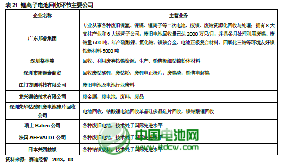 目前,在河北清河、廣東清遠、江蘇太倉、山東臨朐、湖南安化等地形成了全國性的廢舊電池集散地,在廣東、浙江一帶集中了一些回收廢舊電池并進行拆解分類的企業。行業內做得最大的鋰電回收企業是廣東的邦普集團,該集團專注于各種廢舊鎳氫、鎳鎘、鋰離子等二次電池的回收與處理,在該領域類具有較強的實力。另外還有深圳市衡源泰商貿有限公司、潮州澳佳化工廠、深圳榮華鈷酸鋰廢電池硅片回收公司、龍興鎳鈷技術有限公司等電池回收公司。但這些從事鋰離子電池回收利用的企業絕大部分以廢料收集、分類等粗加工為目的,并沒有對鎳、鈷、鋰等再生資源進行深度處理。而在再生資源深度處理環節,國內目前僅有深圳格林美高新技術股份公司。