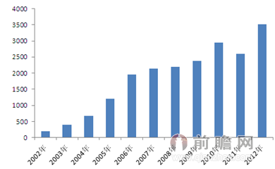 2002-2012年中國電動自行車產量變化趨勢圖(單位:萬輛)