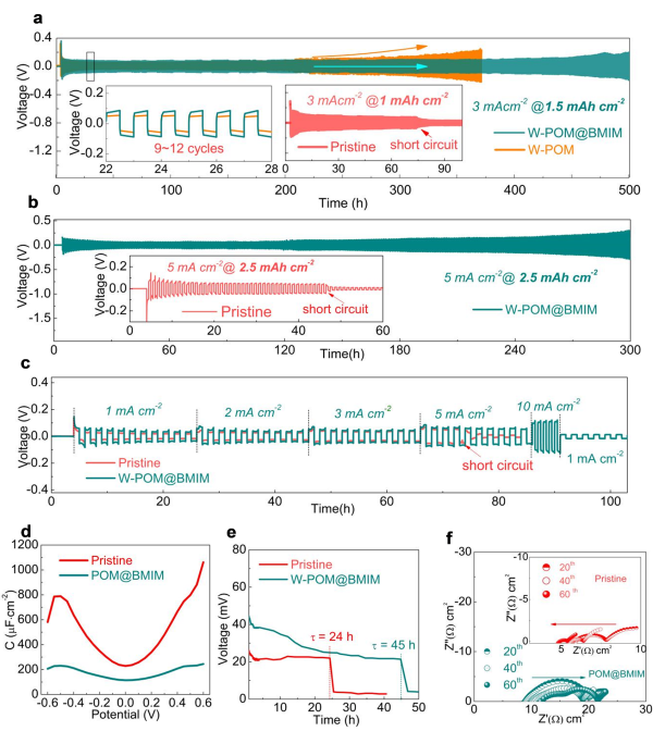在鋰離子電鍍過程中,表面帶正電荷的添加劑易吸附在突起的電子集中分布的尖端上,靠近這些區域的鋰離子受到一定程度的排斥,從而使鋰離子在負極上的流動分布趨于均勻化。逐漸釋放的具有非定域負電荷和豐富O官能團的無機POM核將收集從尖端排斥至周圍的鋰離子或在電解液中溶劑化的鋰離子。在重復充放電過程中的電場力作用下,POM聚陰離子和反電荷離子之間的動態可逆和非錨定的靜電相互作用使POM的釋放具有可持續性。在捕獲電子后,這些POM核將和被吸收的鋰離子共組裝,類似特殊的成核調節器,因此,Li離子流和Li金屬沉積被進一步引導和均化。這一斥鋰-富集協同機制促進LiF和LiNxOy組分在負極界面層(SEI)的富集,利于對鋰枝晶的抑制作用。