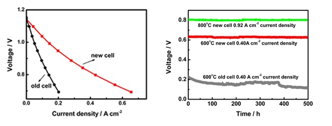 該團隊研制出了LSM-YSZ微納陰極電池,電池輸出性能是傳統(tǒng)LSM-YSZ陰極電池的2至3倍,并且在600oC至800oC下運行穩(wěn)定。在LSM-YSZ微納陰極中,納米級LSM顆粒和YSZ顆粒的緊密接觸增加了三相反應界面密度,大幅度地提高了陰極的氧還原活性。同時,納米級LSM顆粒與納米級YSZ顆粒的界面穩(wěn)定提高了陰極在運行條件下的穩(wěn)定性。