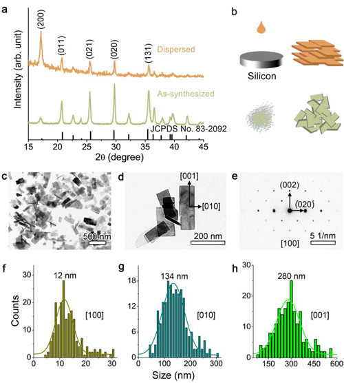 圖1(a)新合成的樣品和把樣品分散后再滴到非晶硅上的XRD圖譜。(b)圖a的示意圖。(c, d)LiFePO4的TEM圖。(e)對(duì)應(yīng)(d)的電子衍射花樣。用高斯函數(shù)擬合LiFePO4晶粒沿著不同方向的尺寸統(tǒng)計(jì)數(shù)據(jù)。(f)a軸,12 nm,(g)b軸,134 nm,(h)c軸,280 nm。