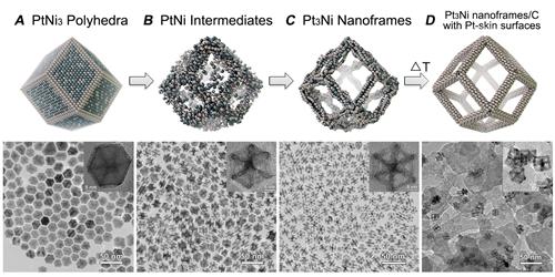 研究發(fā)現(xiàn),在溶液中的起始材料——固態(tài)晶體PtNi3多面體會轉(zhuǎn)變?yōu)镻tNi中間物質(zhì),然后通過內(nèi)部腐蝕,轉(zhuǎn)變?yōu)镻t3Ni納米框架,氧原子可以從中間通過。PtNi3多面體的棱邊由高濃度鉑組成,它在后來的Pt3Ni納米框架中也得到保留。最初的多面體由三個鎳原子和一個鉑原子構成,最終的納米框架則正好相反。