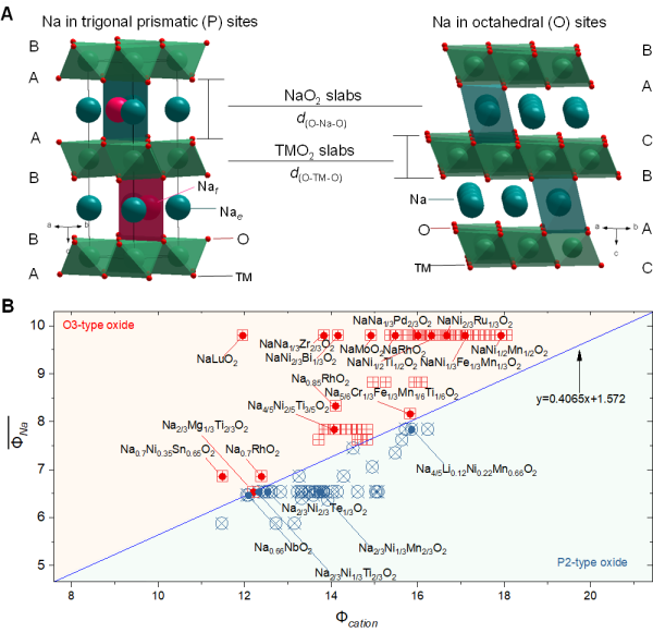 圖1.陽離子勢及其在鈉離子層狀氧化物中的應(yīng)用。(A)典型P2型和O3型鈉離子層狀氧化物晶體結(jié)構(gòu)示意圖;(B)具有不同鈉含量、不同過渡金屬氧化態(tài)和組成的P2型和O3型鈉離子層狀氧化物在以陽離子勢Φcation為橫坐標(biāo),鈉的加權(quán)平均離子勢為縱坐標(biāo)的直角坐標(biāo)系中的分布圖