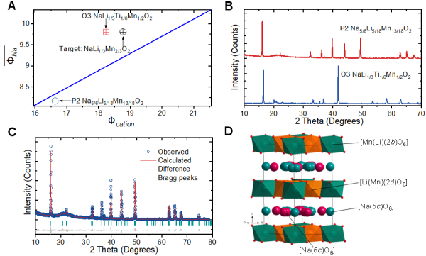 圖2.根據(jù)陽離子勢設(shè)計(jì)富鈉O3材料。(A)Na-Li-Mn(Ti)-O的陽離子勢分析;(B)初始組成Na[Li1/3Mn2/3]O2的XRD圖譜和相關(guān)標(biāo)準(zhǔn)圖譜;(C)O3-Na[Li1/3Ti1/6Mn1/2]O2的結(jié)構(gòu)精修XRD圖譜;(D)[Li1/3Ti1/6Mn1/2]O2層中Li/Mn(Ti)有序排布的結(jié)構(gòu)示意圖