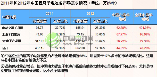 2012年全球動力鋰離子電池市場增長總量527.12萬kWh,雖然與3C小電池還有近100萬kWh的差距,但增長速度(近100%)遠高于小電池(不到30%);交通工具各細分市場呈現全面增長態勢,工業&儲能市場目前還主要依賴電動工具,但智能電網儲能和移動基站電源市場增長很快。