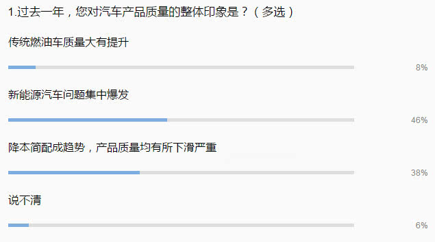 除了新能源汽車問題的集中爆發外,新車產品質量嚴重下滑成為參與者們的第二大選擇項,該項參與人數占比達38%。正如J.D. Power(君迪)發布的2018中國新車質量研究報告所述,在持續多年的提升之后,中國汽車行業整體新車質量在2018年有所退步,不過該研究指出,退步的原因主要是導航不夠準確、語音識別差等設計類問題的增加。