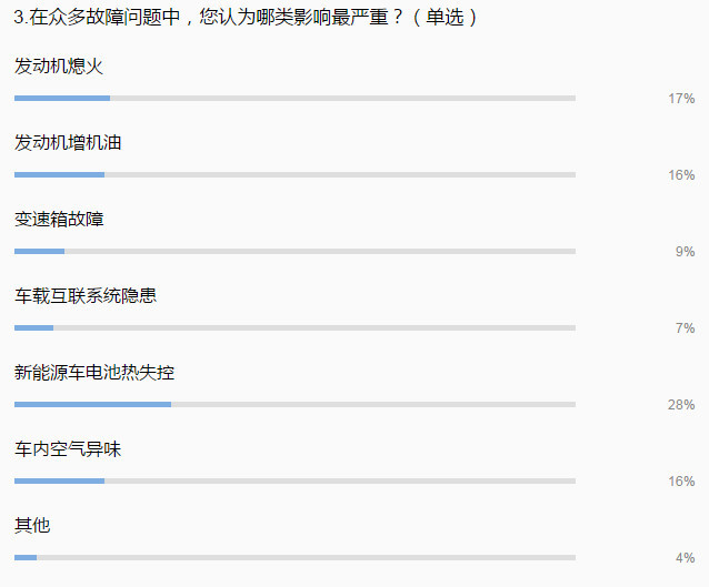 因此,在調研問題3中,當被問及“眾多故障問題中,哪類影響最嚴重”時,28%的參與者毫不猶豫地選擇了“新能源汽車電池熱失控”。據了解,當電池工作時產生的熱量不能及時排出,高溫就會影響動力電池壽命甚至出現熱失控,重則導致起火。