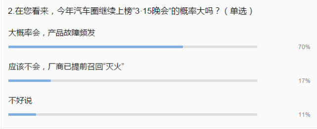 鑒于產品故障頻發,高達70%的參與者認為汽車圈上榜今年“3.15”晚會將成大概率事件,且德系、自主品牌、美系成參與者預測上榜概率最大的三大車系。