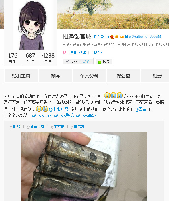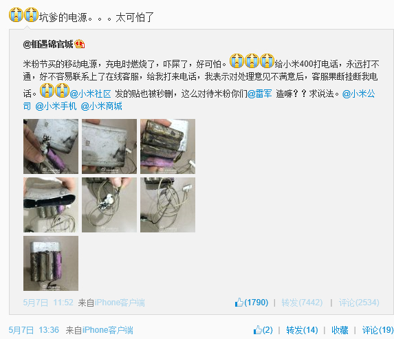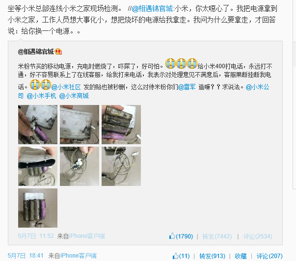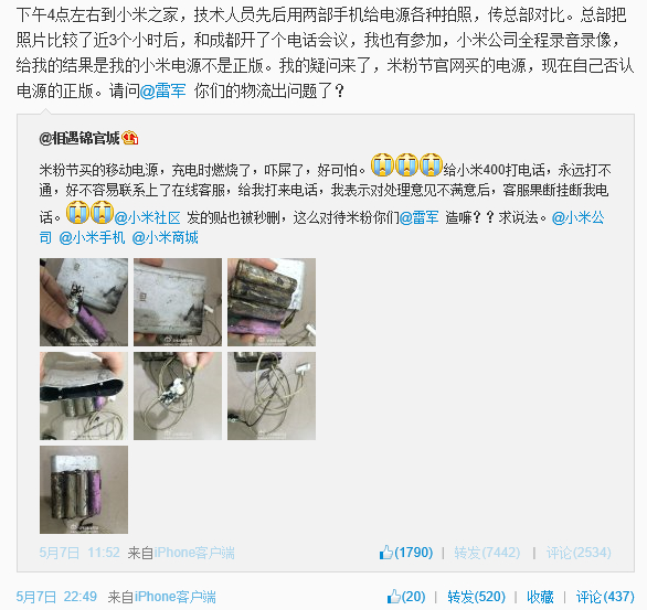 5月7日中午12點左右,一位成都的女性微博網(wǎng)友@相遇錦官城發(fā)微博稱:米粉節(jié)買的移動電源,充電時燃燒了,嚇屎了,好可怕。給小米400打電話,永遠打不通,好不容易聯(lián)系上了在線客服,給我打來電話,我表示對處理意見不滿意后,客服果斷掛斷我電話。@小米社區(qū) 發(fā)的貼也被秒刪,這么對待米粉你們@雷軍 造嘛??求說法。
