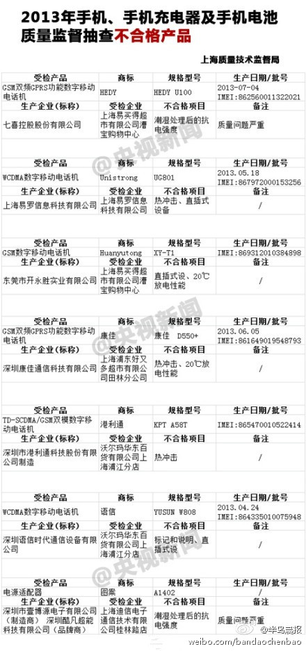 【[話筒]小心!這些手機(jī)、充電器不合格】手機(jī)充電發(fā)生爆炸、充電時(shí)接電話觸電,這樣的報(bào)道屢見(jiàn)不鮮,專(zhuān)家稱(chēng)很可能與電池或充電器有關(guān)。近日,上海質(zhì)量技術(shù)監(jiān)督局抽查了一批手機(jī)、充電器,發(fā)現(xiàn)有7批次產(chǎn)品不符合標(biāo)準(zhǔn)規(guī)定,有的在“潮濕處理后的抗電強(qiáng)度”不合格。via央視新聞~快來(lái)看看有你正在