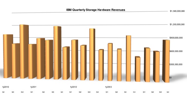 IBM最新季度報表和全年財政結果顯示,在2014年度存儲硬件業務營收衰減之勢并沒有停止。2014年第四季度營收下滑8個百分點,8.64億美元。