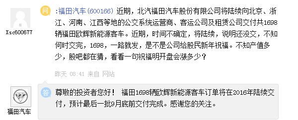 福田汽車(600166)周二在上證e互動平臺表示,福田1698輛歐輝新能源客車訂單將在2016年陸續交付,預計最后一批9月底前交付完成。