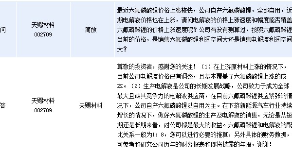 天賜材料(002709)周三晚間在全景網互動平臺上表示,在上游原材料上漲的情況下,目前公司電解液價格已有調整,且基本覆蓋了六氟磷酸鋰上漲的成本。