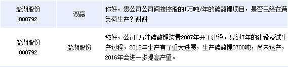 鹽湖股份(000792)周一在全景網(wǎng)互動平臺表示,公司1萬噸碳酸鋰裝置2015年生產(chǎn)有了重大進展,生產(chǎn)碳酸鋰3700噸,尚未達產(chǎn),2016年會進一步提高產(chǎn)量。