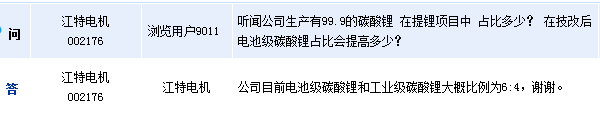 江特電機(002176)周四在全景網(wǎng)互動平臺表示,公司目前電池級碳酸鋰和工業(yè)級碳酸鋰大概比例為6:4。