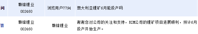 贛鋒鋰業(yè)(002460)周四在全景網(wǎng)互動平臺上表示,RIM公司的鋰礦項目進展順利,預計6月開始投入生產(chǎn)。