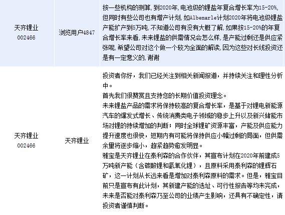 周一天齊鋰業(yè)(002466)在全景網(wǎng)互動(dòng)平臺(tái)上表示,未來(lái)鋰鹽產(chǎn)品的需求將保持較高的復(fù)合增長(zhǎng)率,是基于對(duì)鋰電新能源汽車(chē)的爆發(fā)式增長(zhǎng)、傳統(tǒng)消費(fèi)類(lèi)電子領(lǐng)域的穩(wěn)步上升以及新興儲(chǔ)能市場(chǎng)對(duì)鋰的持續(xù)增加的判斷;同時(shí)全球鋰礦資源豐富,產(chǎn)能及供應(yīng)能力提升速度也很快,短期內(nèi)有可能將保持供應(yīng)小幅過(guò)剩的局面,但供需余量將逐步縮小,趨緊趨勢(shì)愈發(fā)明顯。