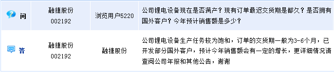 融捷股份(002192)周四晚間在全景網互動平臺上介紹,公司鋰電設備生產任務較為飽和,訂單的交貨期一般為3-6個月,已開發部分國外客戶,預計今年銷售額會有一定的增長。