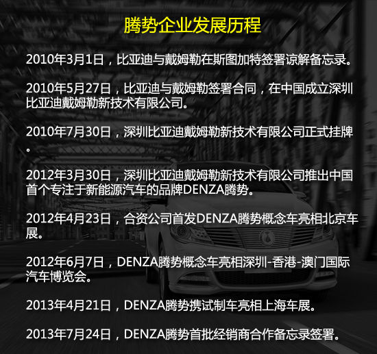 2012年3月30日,比亞迪汽車有限公司和戴姆勒按照50:50投資合資成立的深圳比亞迪戴姆勒新技術有限公司(BDNT)正式發布了其全新的汽車品牌——騰勢,英文名稱為DENZA。同時,品牌的口號“EV the Future”也正式發布。