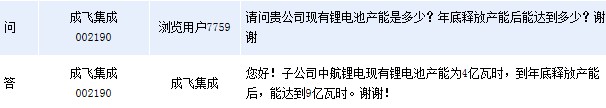 近日成飛集成(002190)在全景網(wǎng)互動(dòng)平臺(tái)上表示, 子公司中航鋰電現(xiàn)有鋰電池產(chǎn)能為4億瓦時(shí),到年底釋放產(chǎn)能后,能達(dá)到9億瓦時(shí)。