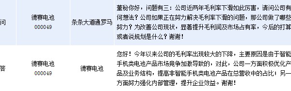 周五德賽電池(000049)在全景網互動平臺上表示, 今年以來公司的毛利率出現(xiàn)較大的下降,主要原因是由于智能手機類電池產品市場競爭加劇導致的,對此,公司一方面積極優(yōu)化產品及業(yè)務結構,提高非智能手機類電池產品在總營收中的占比;另一方面努力強化內部管理,提升企業(yè)效益。