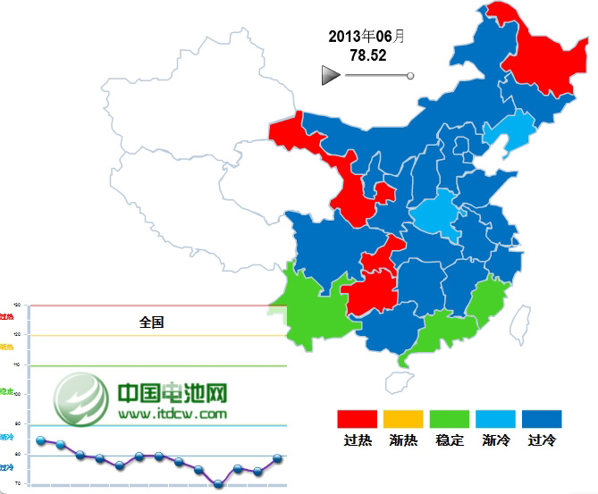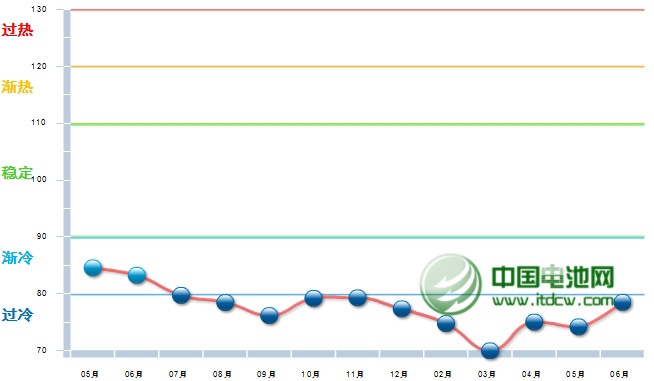 2012年7月以來,中輕電池景氣指數持續在 “過冷”區運行。2012年7月至2013年6月指數在“過冷”區連續運行一年,2013年3月份中輕電池景氣指數為68.56,創建立以來新低,之后開始有所回升,6月達78.52。