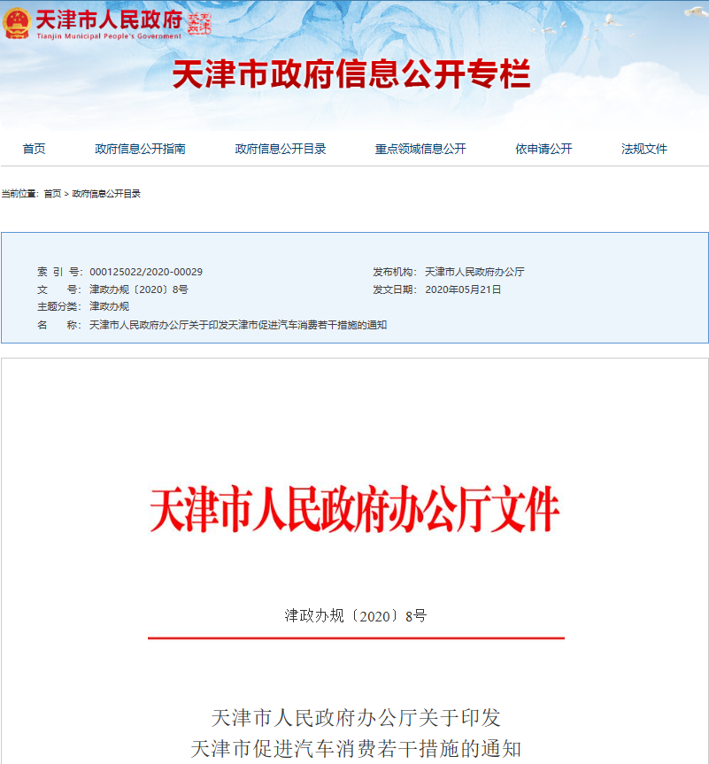 5月21日,天津市人民政府辦公廳印發《天津市促進汽車消費的若干措施》(以下簡稱《措施》),包括新增小客車個人增量指標、推動京津冀同城便利化、放寬個人增量指標申請資格、放寬企業增量指標申請資格、完善小客車限購限行措施、鼓勵新能源汽車消費、推進淘汰報廢老舊柴油貨車、暢通二手車流通交易、推動汽車配套設施建設、加大金融服務支持力度、鼓勵企業促銷十一個方面。這一《措施》是所有地方政策中時間跨度最長的,自2020年6月1日起施行,2025年5月31日廢止(文件中有明確施行期限的除外,將根據疫情防控需要適時進行調整)。