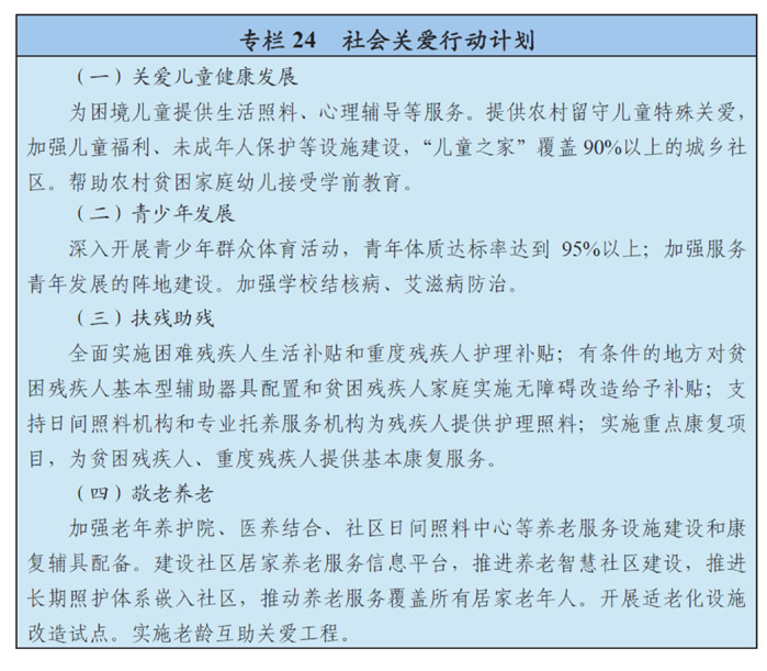 健全以扶老、助殘、愛幼、濟困為重點的社會福利制度。建立家庭養(yǎng)老支持政策,提增家庭養(yǎng)老扶幼功能。做好困境兒童福利保障工作。完善兒童收養(yǎng)制度。加強優(yōu)撫安置工作。發(fā)展公益性基本殯葬服務(wù),支持公共殯儀館、公益性骨灰安放(葬)設(shè)施和墓地建設(shè)。加快公辦福利機構(gòu)改革,加強福利設(shè)施建設(shè),優(yōu)化布局和資源共享。大力支持專業(yè)社會工作和慈善事業(yè)發(fā)展,健全經(jīng)常性社會捐助機制。廣泛動員社會力量開展社會救濟和社會互助、志愿服務(wù)活動。