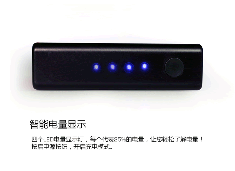 6.四燈LED電量顯示,充電時自動閃爍,按鍵隨時了解電量。