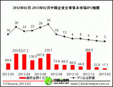 2013年2月,僅有3家中國企業在全球資本市場完成IPO,合計融資17.1億元,環比下降48%,同比下降80.9%。從單筆融資金額來看,本月平均單筆融資規模為5.7億元,較上月有所回落。 2月中企IPO延續頹...