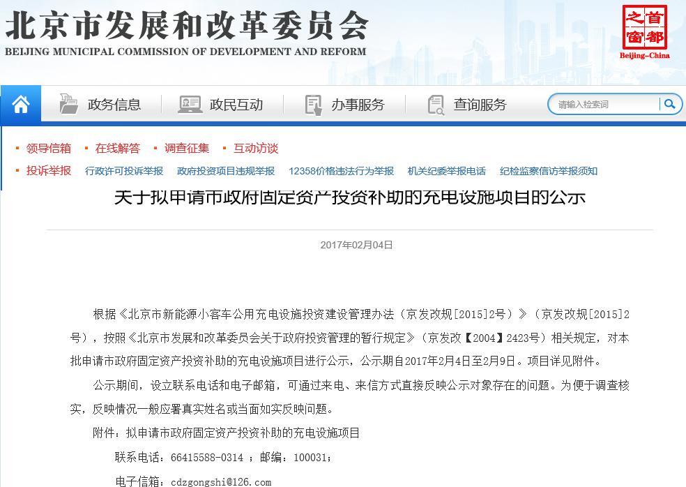 北京發(fā)改委:公示擬申請市政府固定資產(chǎn)投資補助的充電設施項目